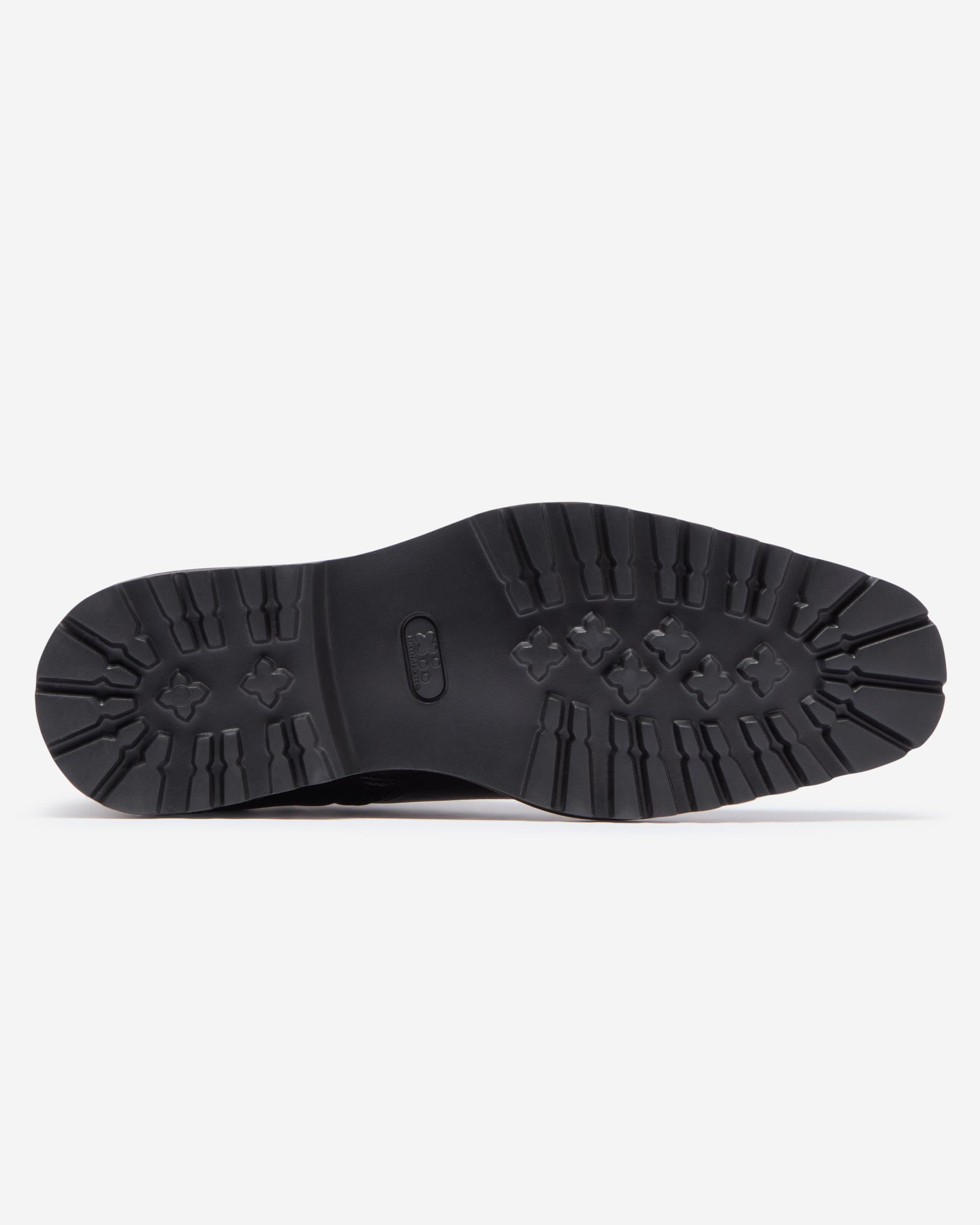 This new zip boot is set on a slightly elongated, square-toed last. The simple classic upper is made from black milled calf leather and has a handy fabric back pull tab. – milled leather has a tumbled, grainy texture with a soft feel. The zip is set on the inner quarter and allows a relatively slim fit around the ankle. Includes a half leather lining and insock with cushioned heel. The upper is cemented to a Finproject Extralight sole – a super lightweight but durable compound with a low-profile cleat.