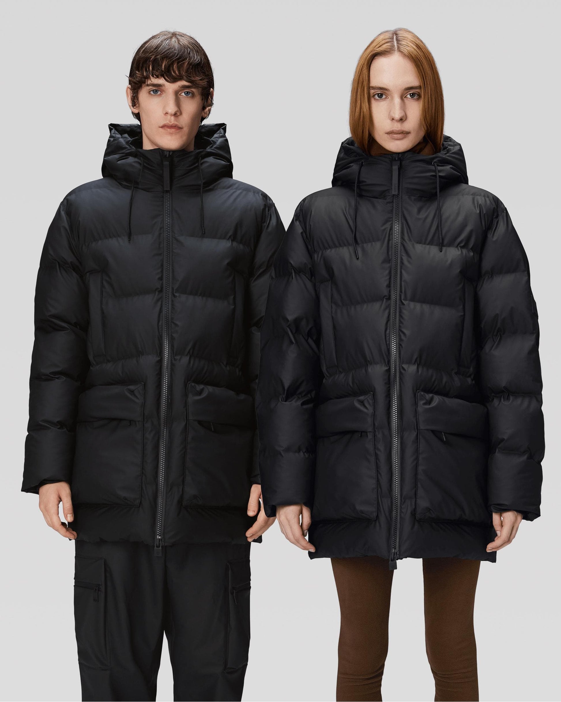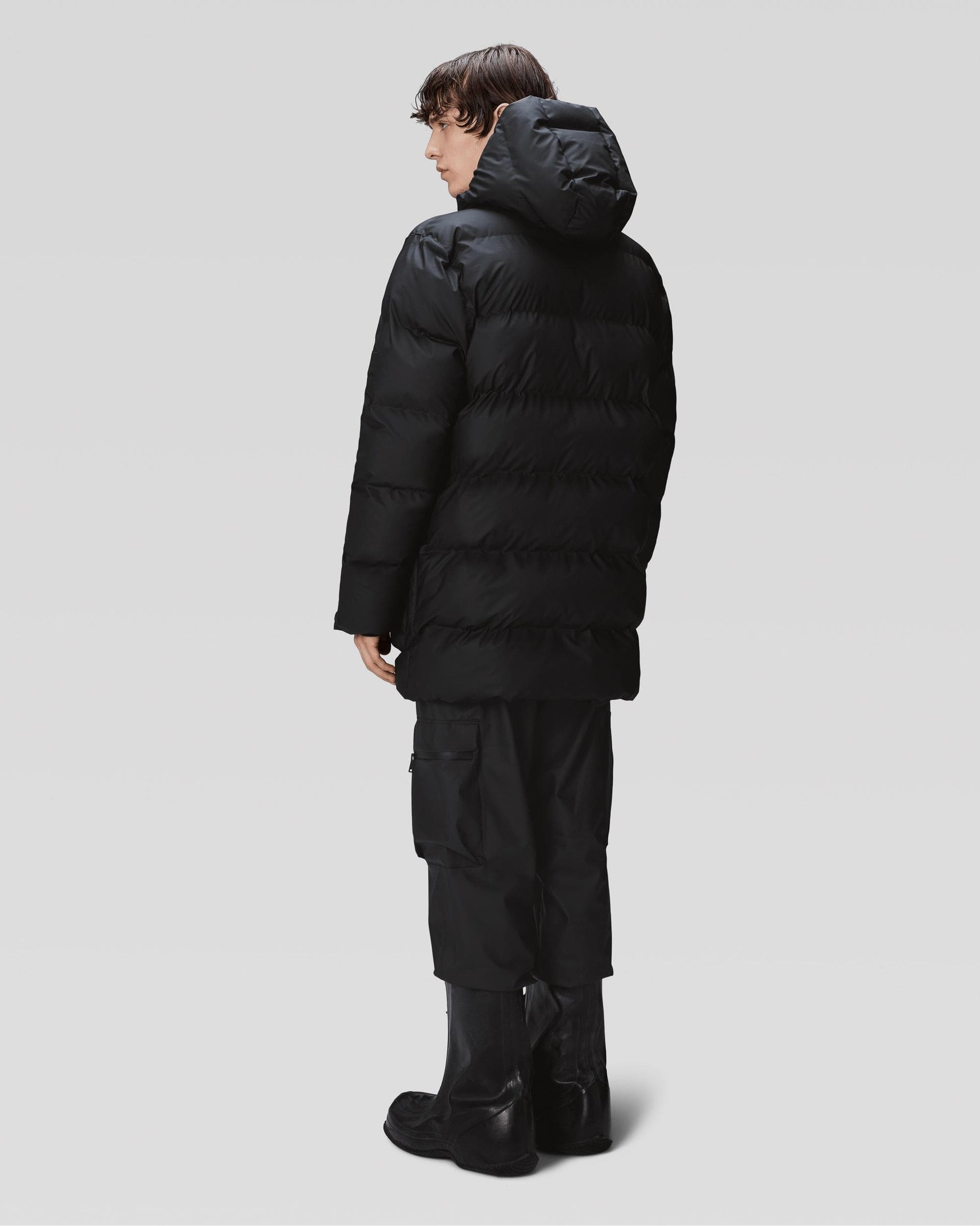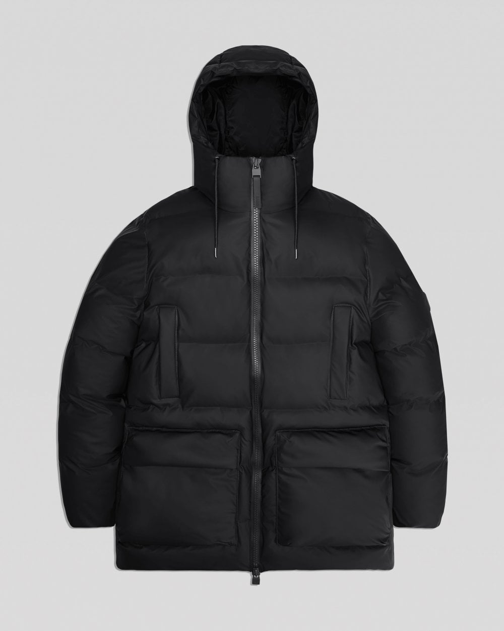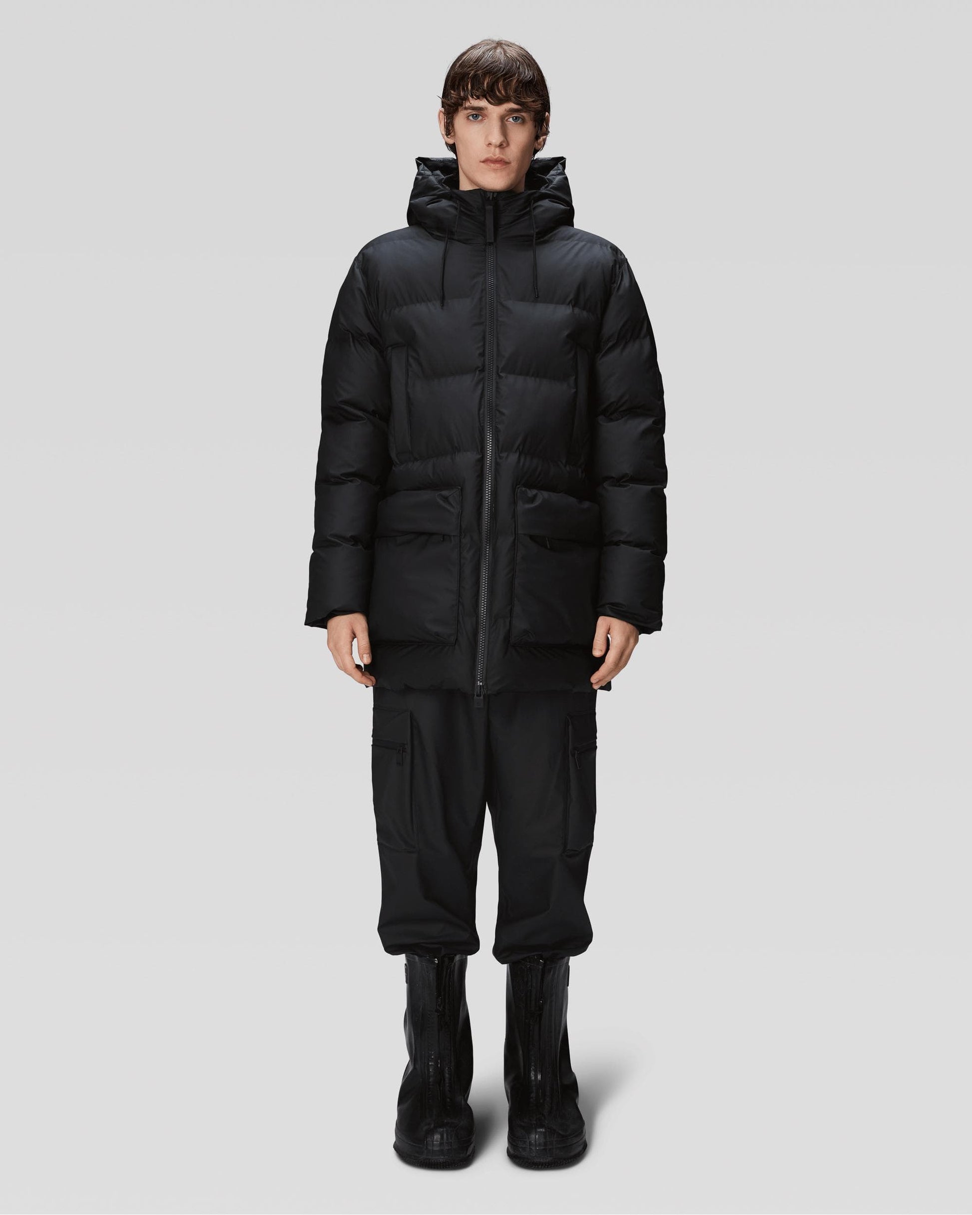Rains Alta Long Puffer Cargo Jacket in 01 Black