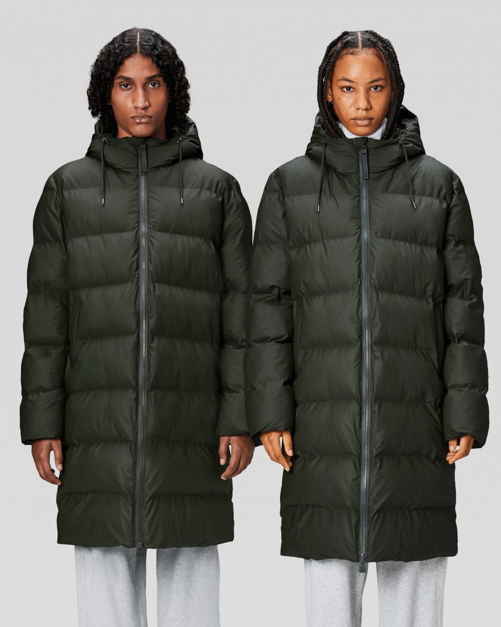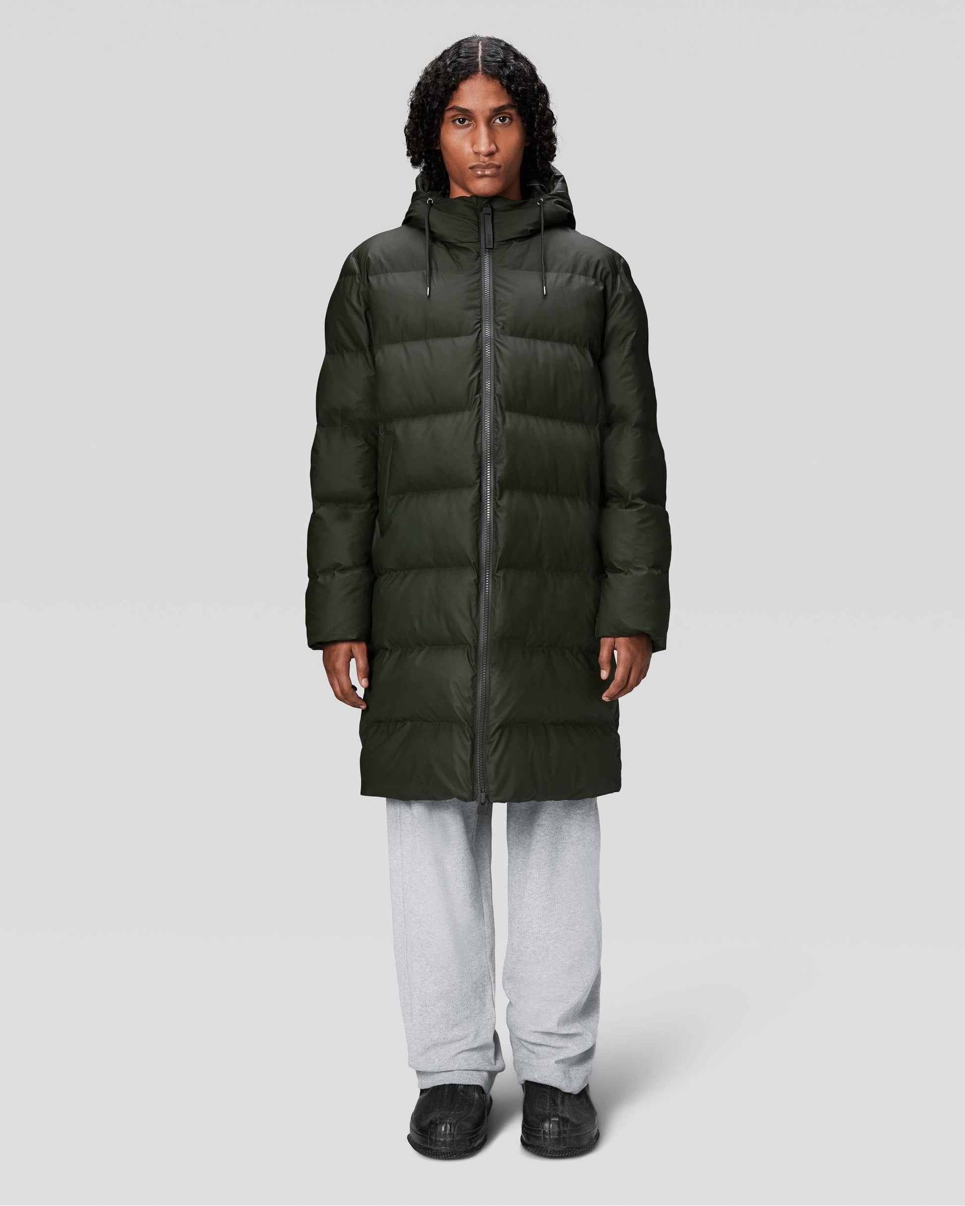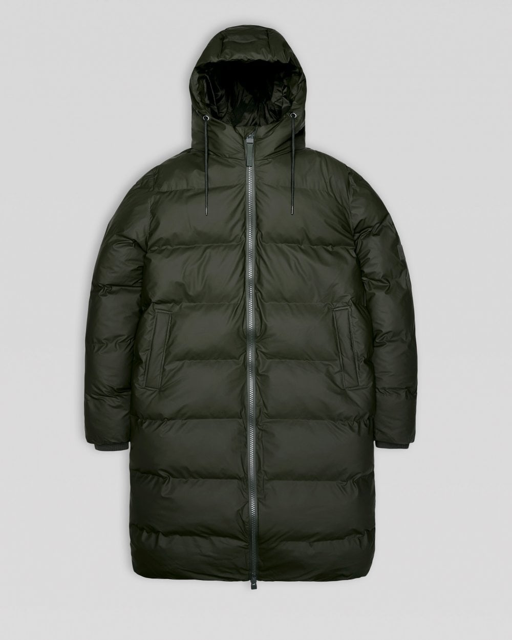 Rains Alta Long Unisex Puffer Jacket in 03 Green