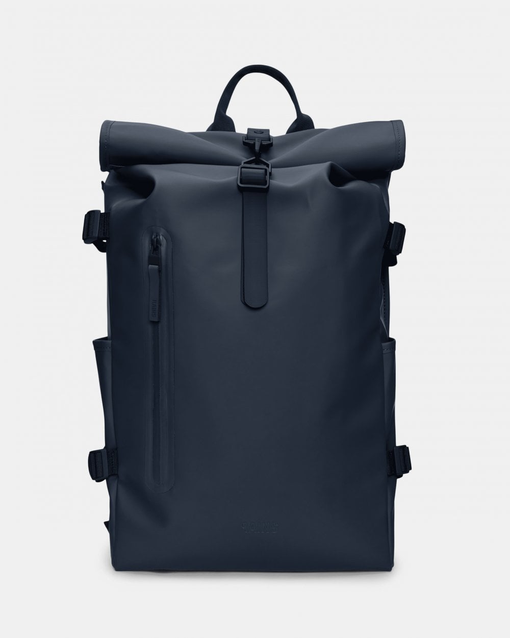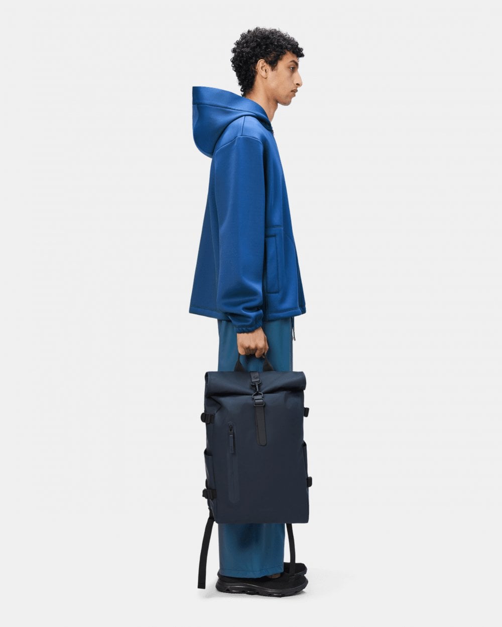 Rolltop Rucksack Large is a dependable city staple. The design interprets Rains' most iconic Rolltop Rucksack with larger proportions and additional functionality.