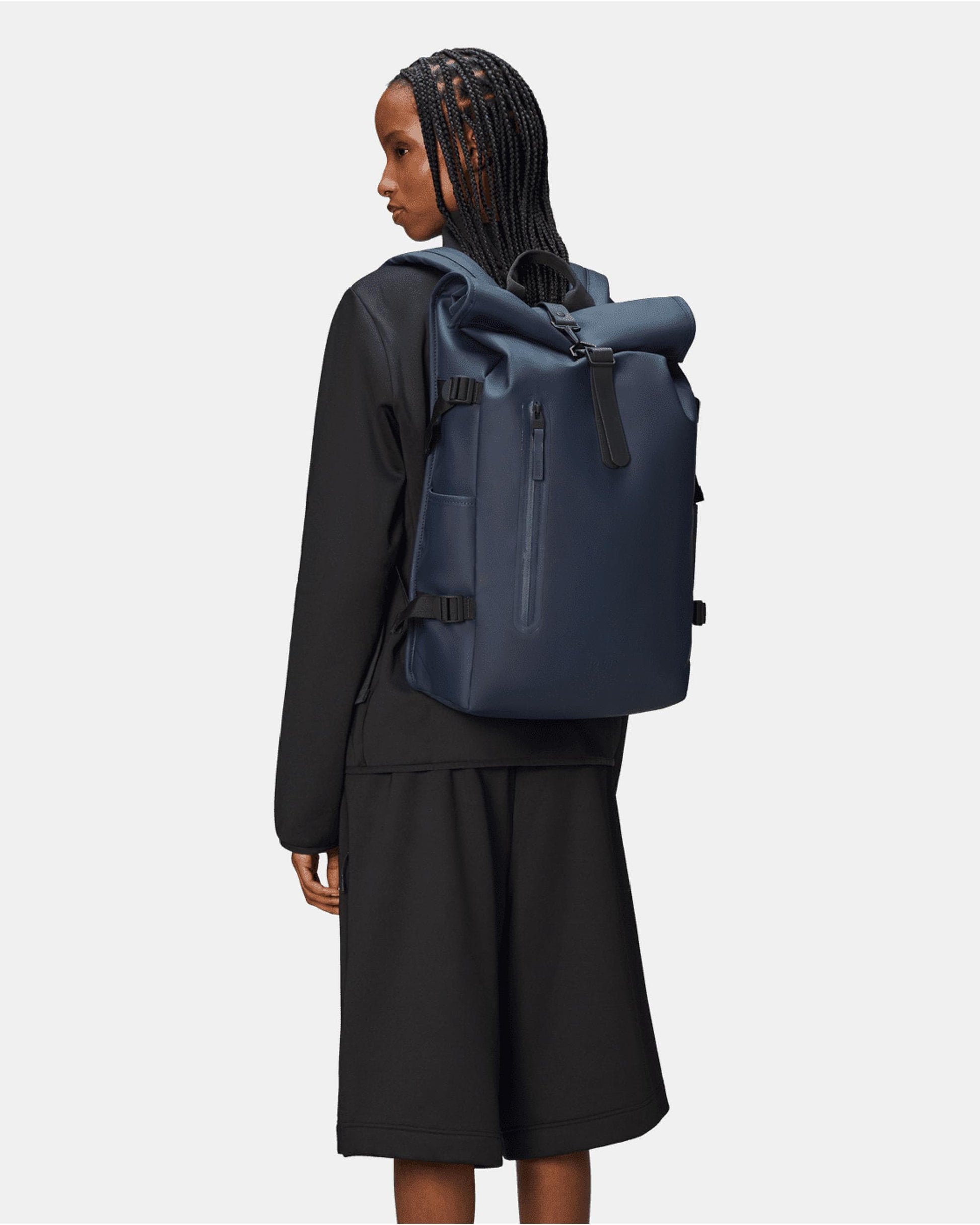 Rolltop Rucksack Large is carefully designed to keep precipitation out when traveling from point A to Z. To protect essentials from rain, fold the rolltop into a tight scroll and secure using the signature carabiner.