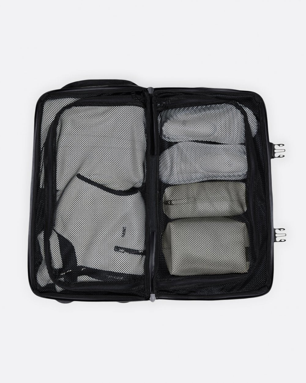 Cabin Bag is Rains’ take on the travel-ready trolley bag. This waterproof trolley combines Rains’ signature waterproof PU with a half-silhouette hard shell for upright stability and general durability. The silhouette can be compressed, and contents secured, via side-mounted adjustable straps.