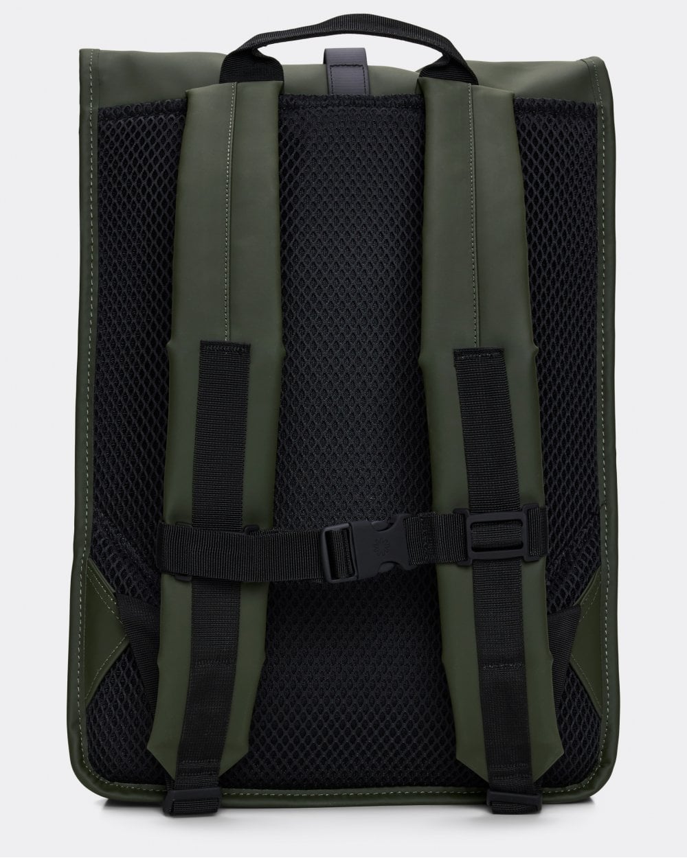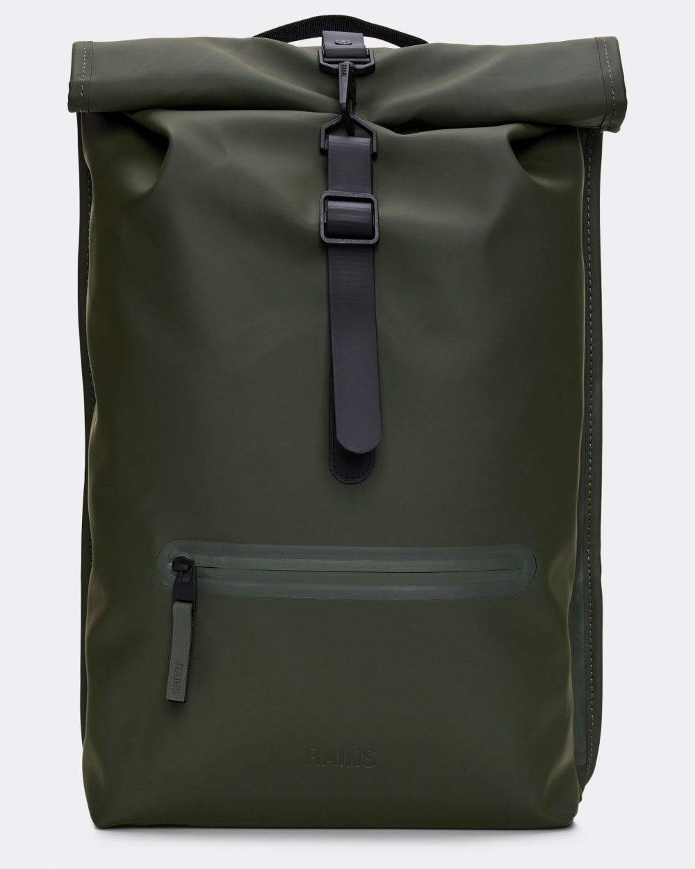 Rolltop Rucksack is cut in Rains’ signature waterproof PU fabric, engineered for carrying strength, durability, and a smooth feel.