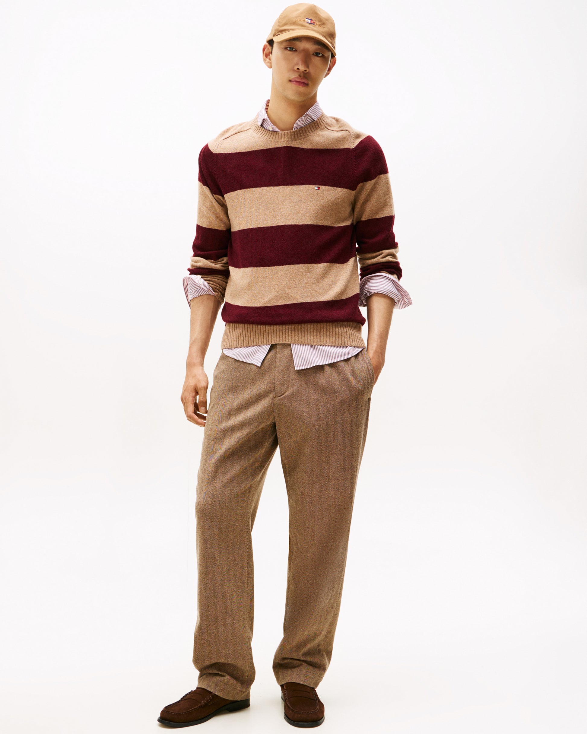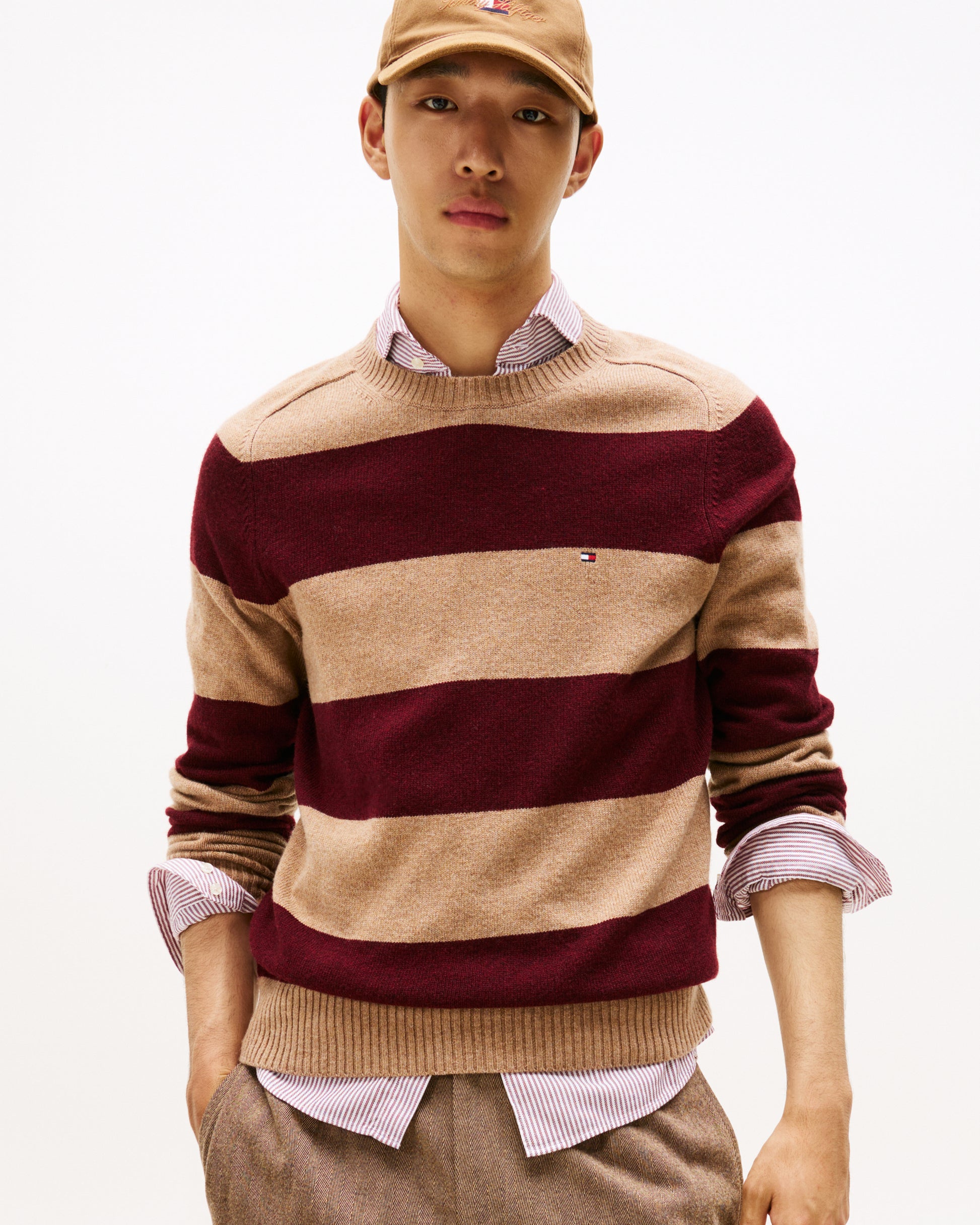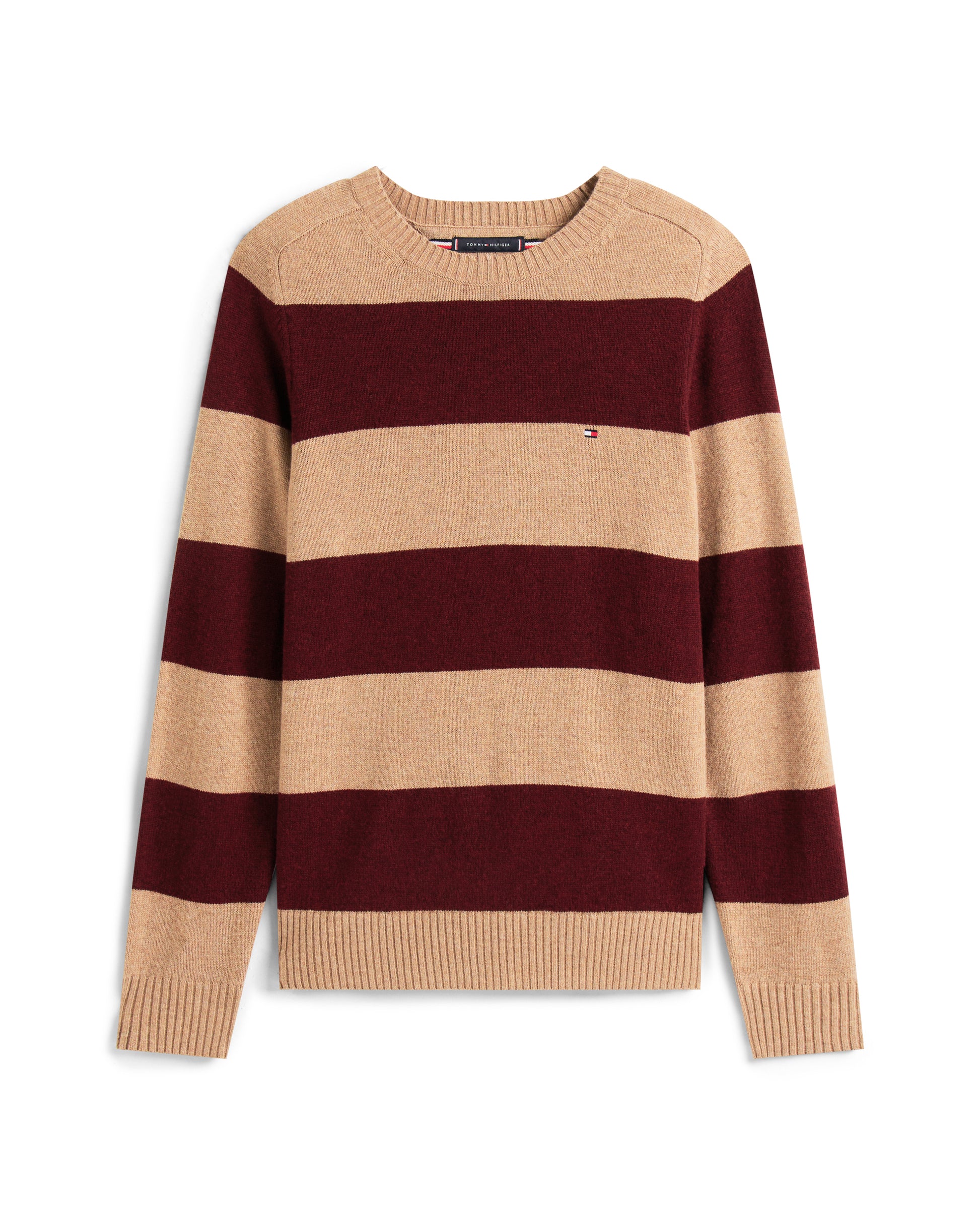 Tommy Hilfiger Lambswool Mens Crew Neck Jumper in Safari Canvas Heather/Deep Burgundy Heather
