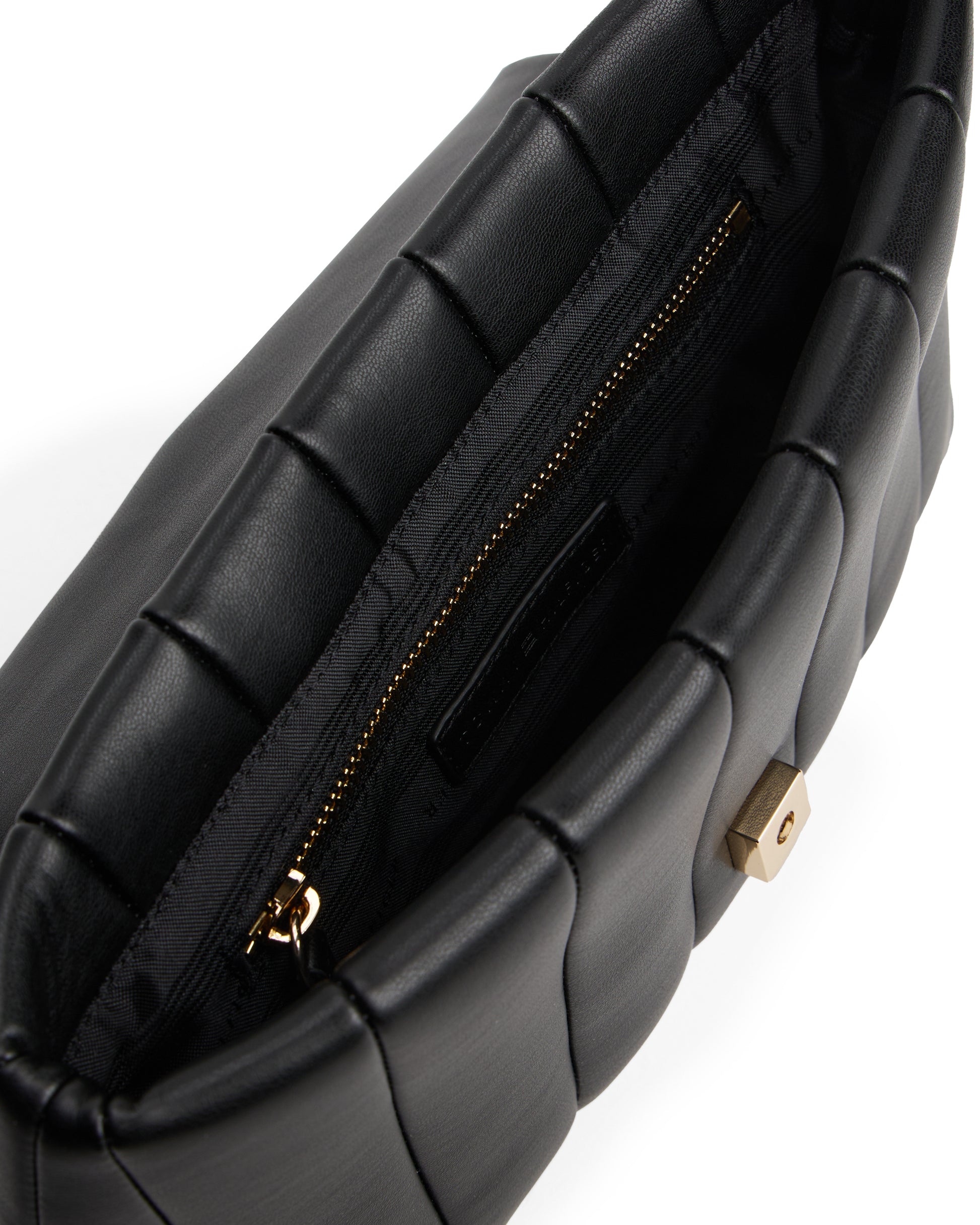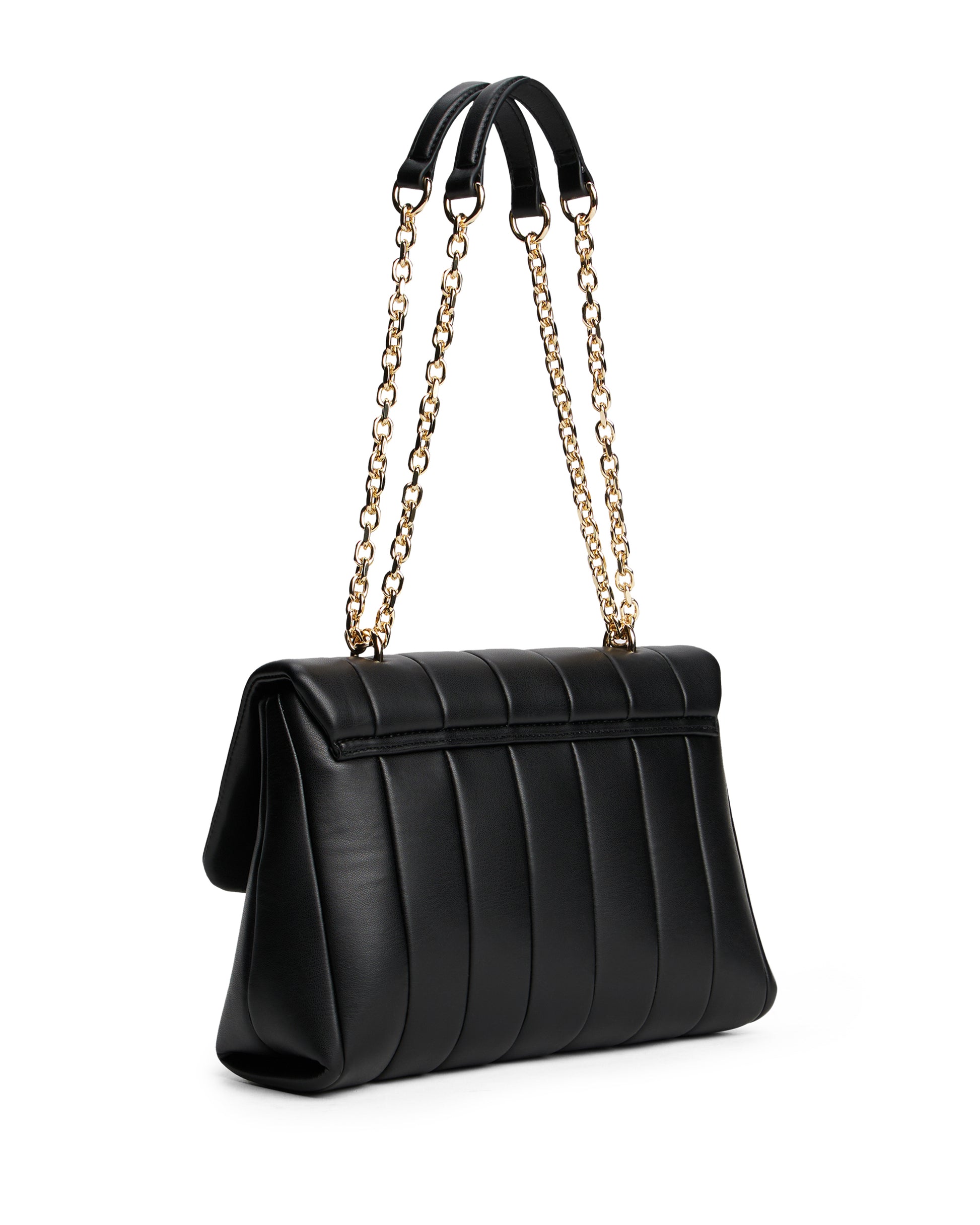This bag features a padded design for a sense of modern glamour, while the adjustable double chain crossbody strap enhances its versatility.